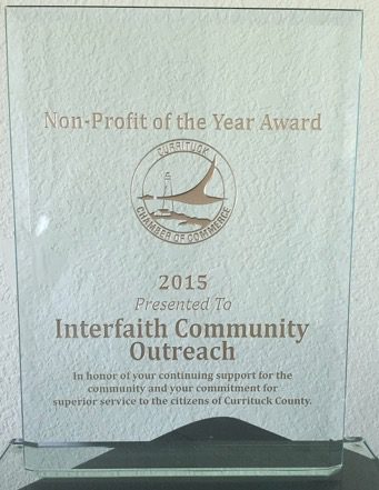 The Currituck County Chamber of Commerce recently awarded the Currituck County Interfaith Community Outreach office the prestigious Non-Profit of the Year Award for 2015.  We are extremely proud of our volunteers, contributors and supporters that make it possible for ICO to continue helping our neighbors in need.